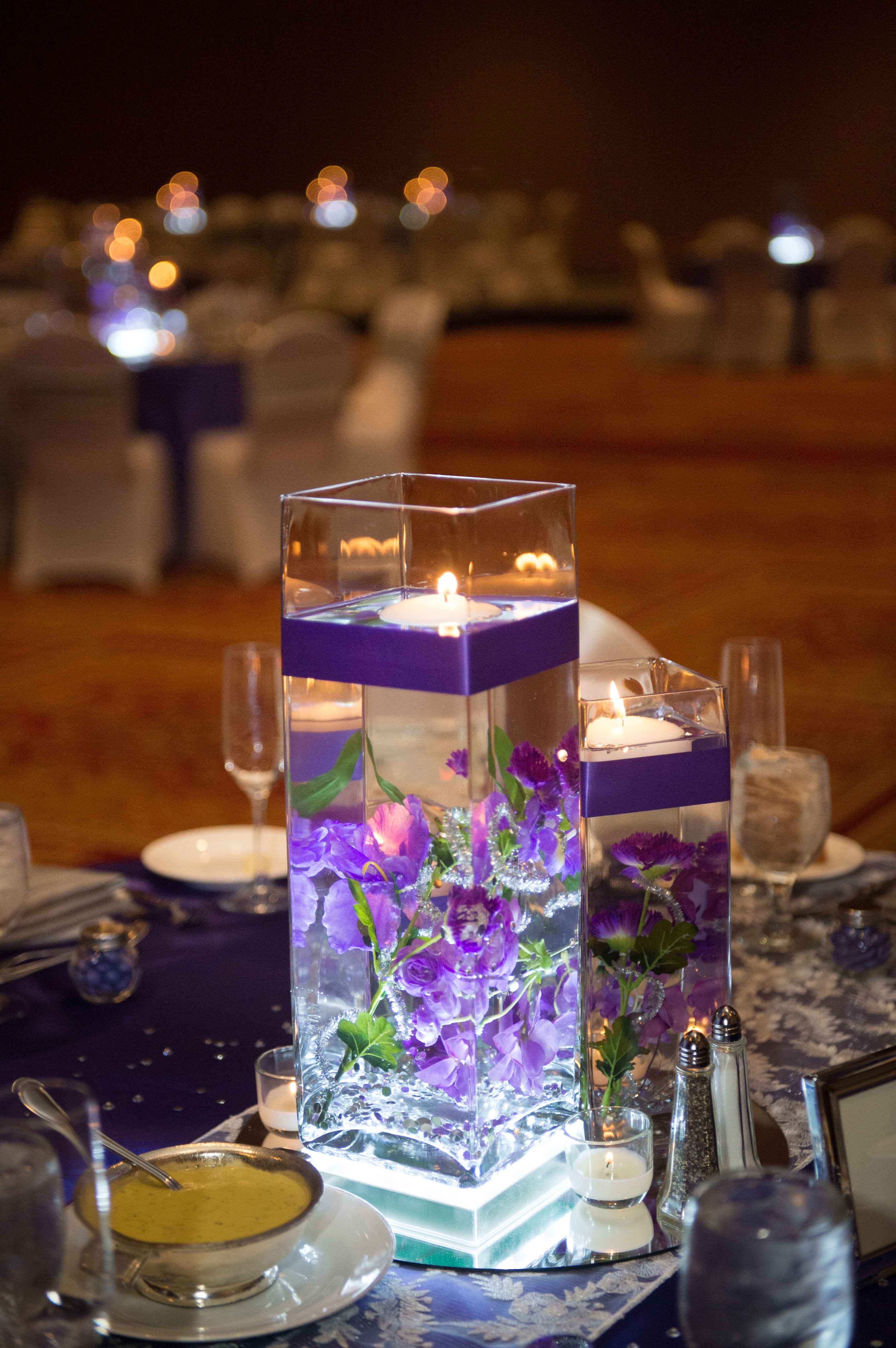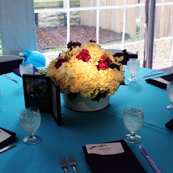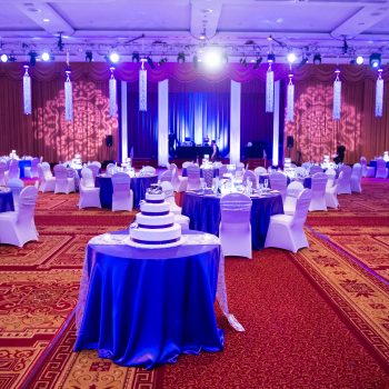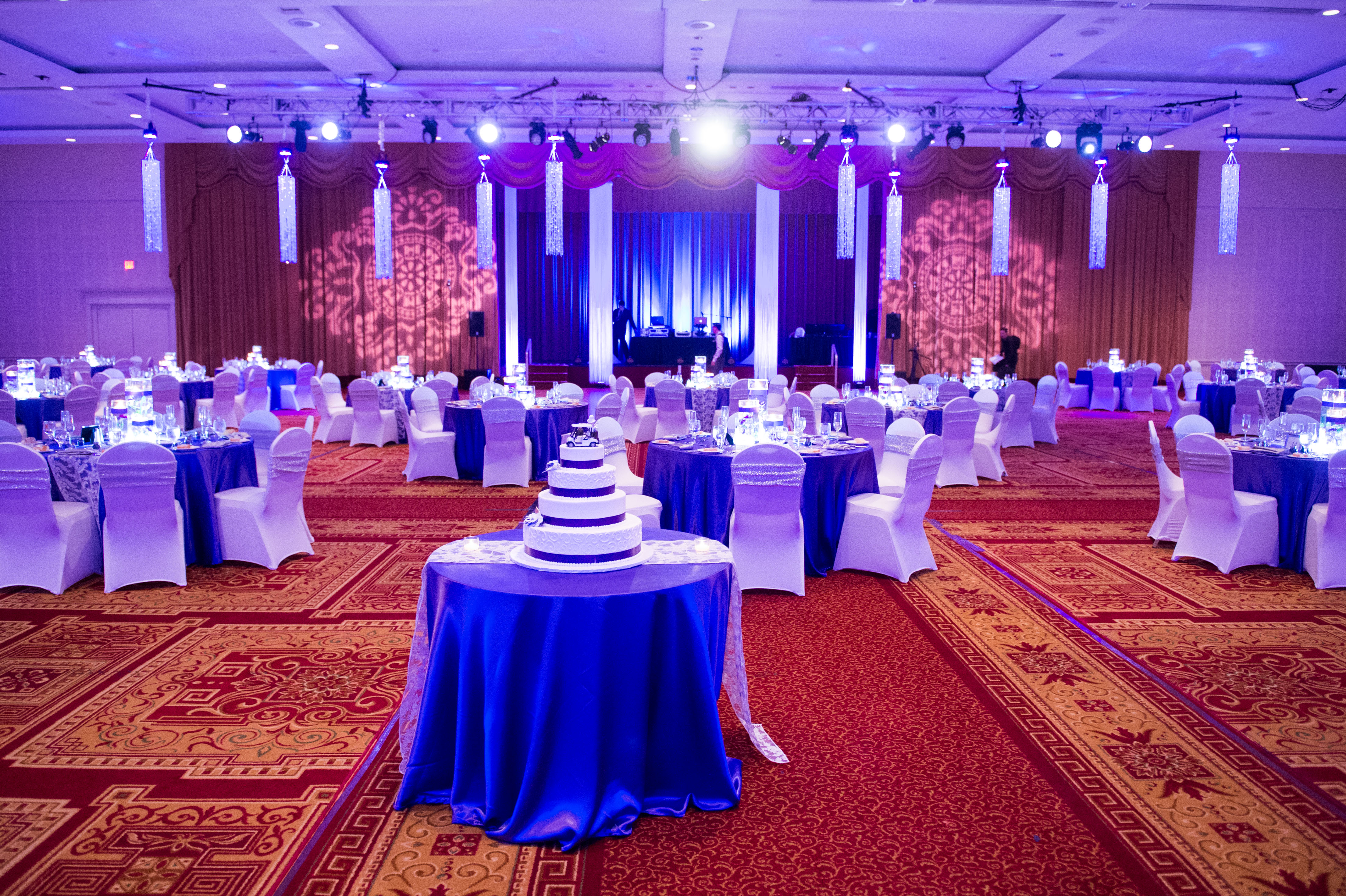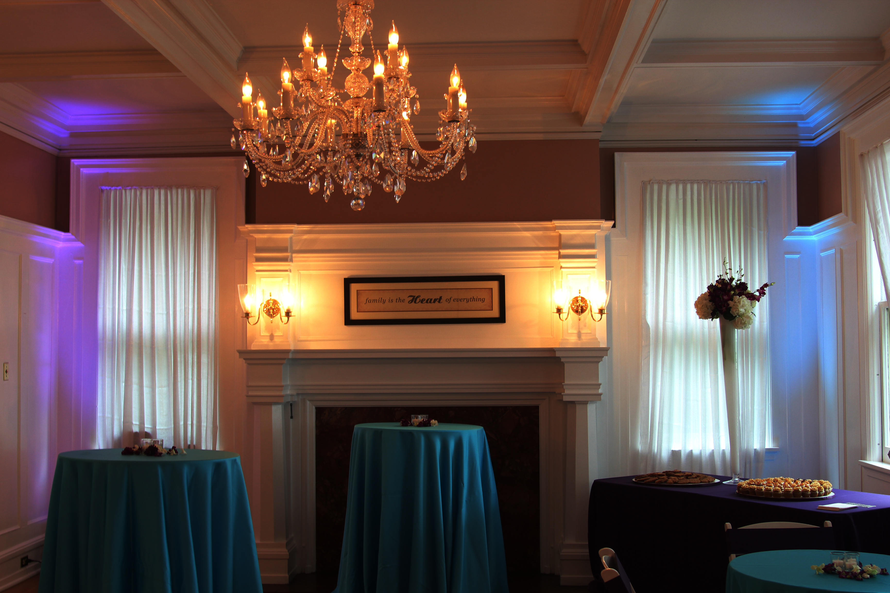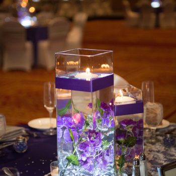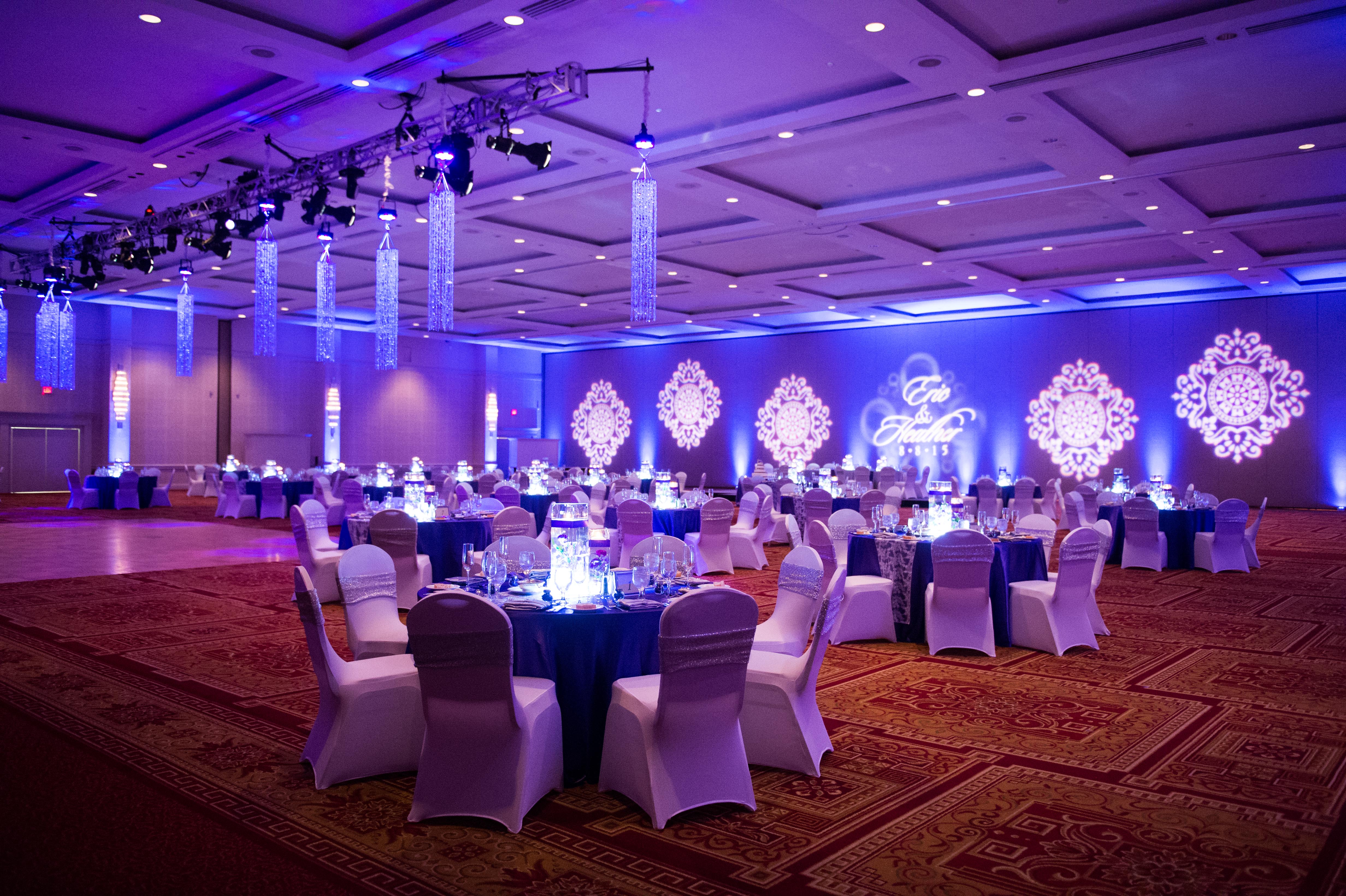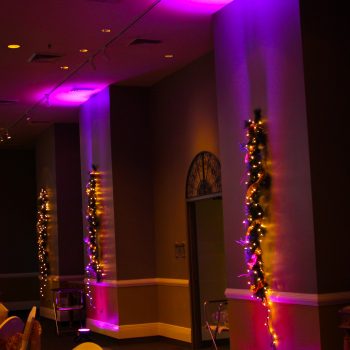 These styles of lights will add an effect to whatever they are shining on! Down-lights will transform your chandeliers while up-lights are used for walls and sconces. Not all venues are able to use pinspot lighting for tables and centerpieces. Using LED up-lights will give you the same effect without changing your centerpieces!