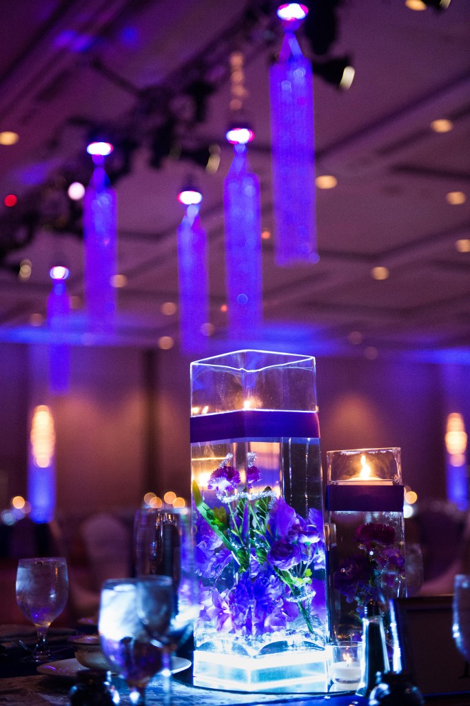Instead of making conversation difficult why not consider pin-spotting or some up-lighting on a shorter more versatile centerpiece. This way everyone is able to see each other, weather it be meeting for the first time or just catching up. The lighting used for these centerpieces are via a wireless, battery operated light that doesn’t get hot to the touch. This way you don’t have to worry about burning or ruining any other décor due to lighting.